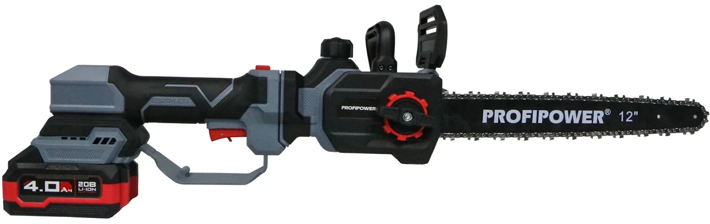 - Аккумуляторная бесщеточная цепная пила Profipower PL-12 артикул E0285 практичная, 20 вольт с удобным управлением - позволяет точно и быстро резать самые различные материалы из дерева (ветки, сучья и т.п.) с помощью удлиненной направляющей (телескопической штанги), пилить на высоте под углом не прибегая к излишней затрате сил.