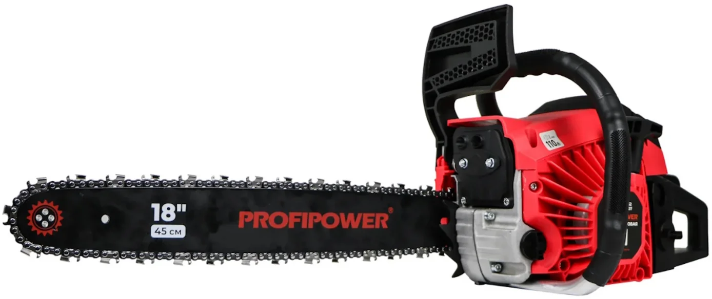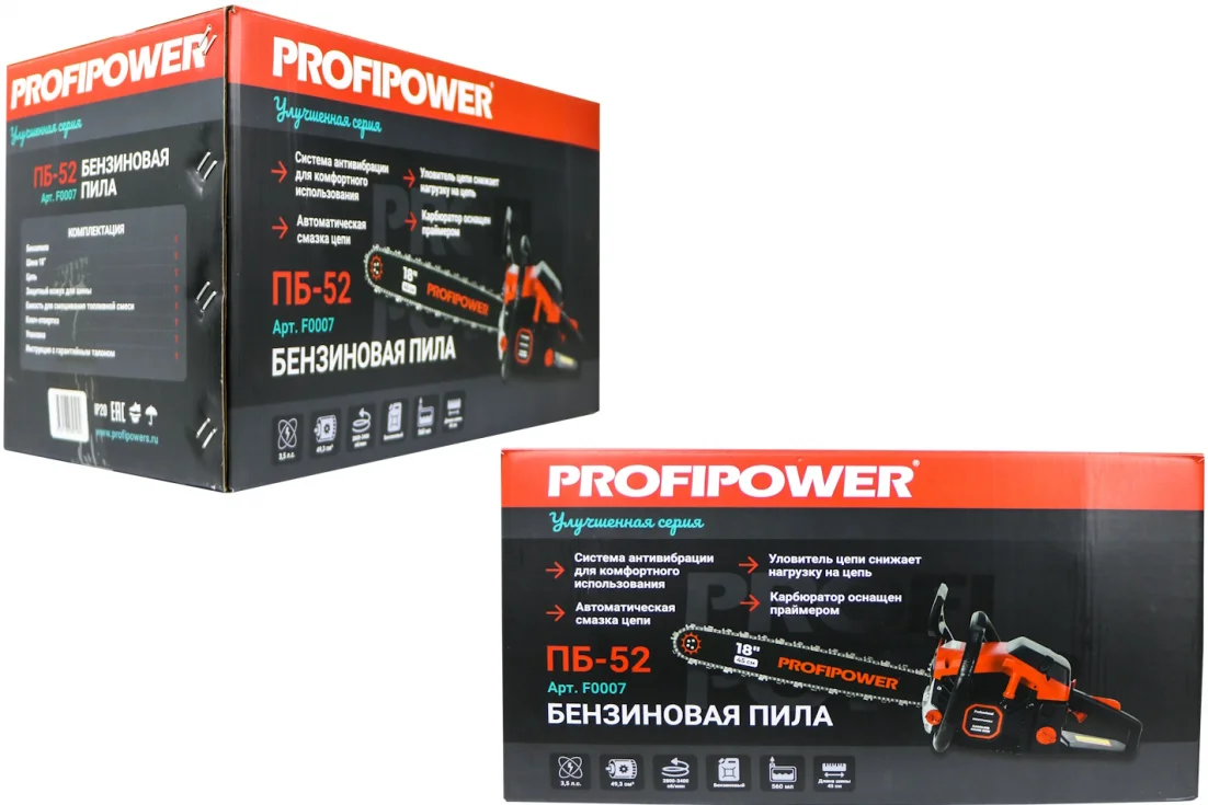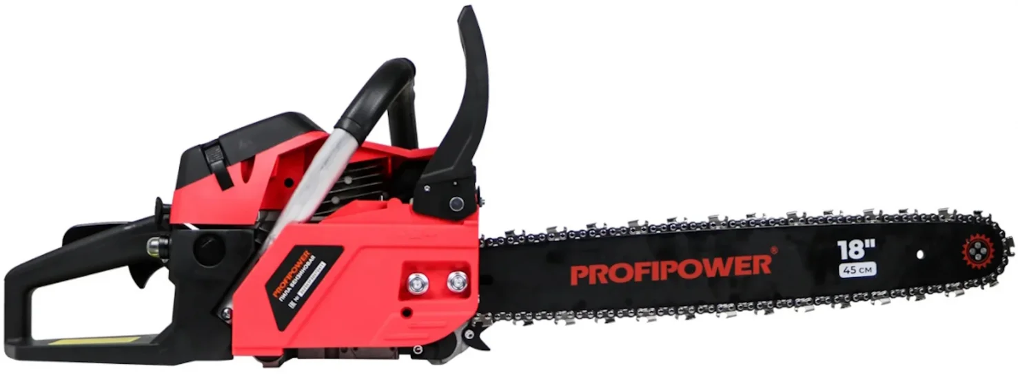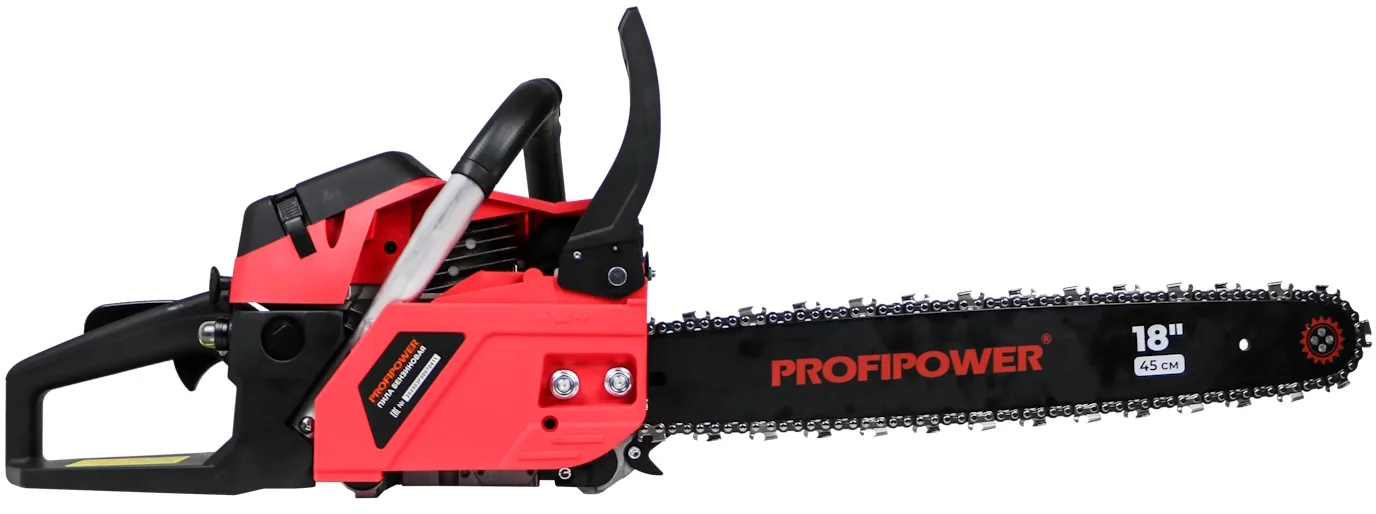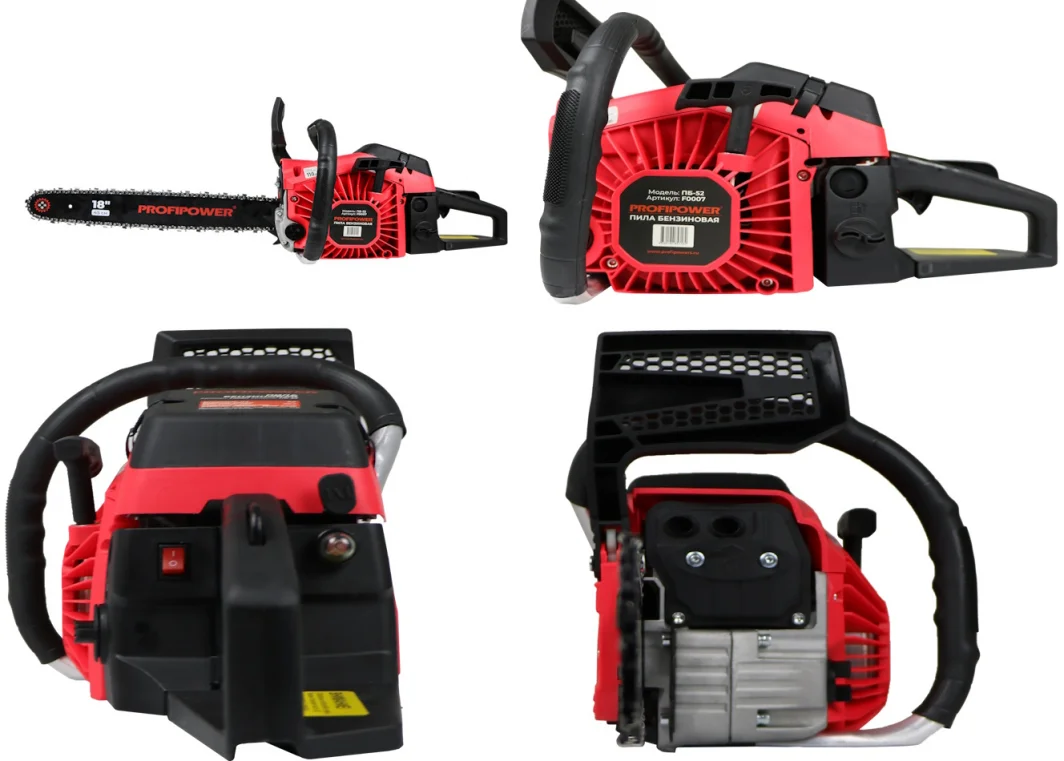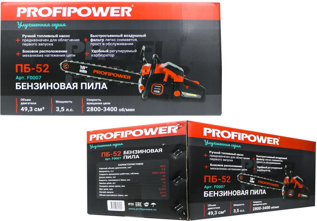 - Бензиновая цепная пила PROFIPOWER ПБ-52, артикул F0007 мощностью 3,5 л.с. и с шиной длиной 45 см., предназначена для валки деревьев, обрезки веток и сучьев, раскряжевки и заготовки дров.