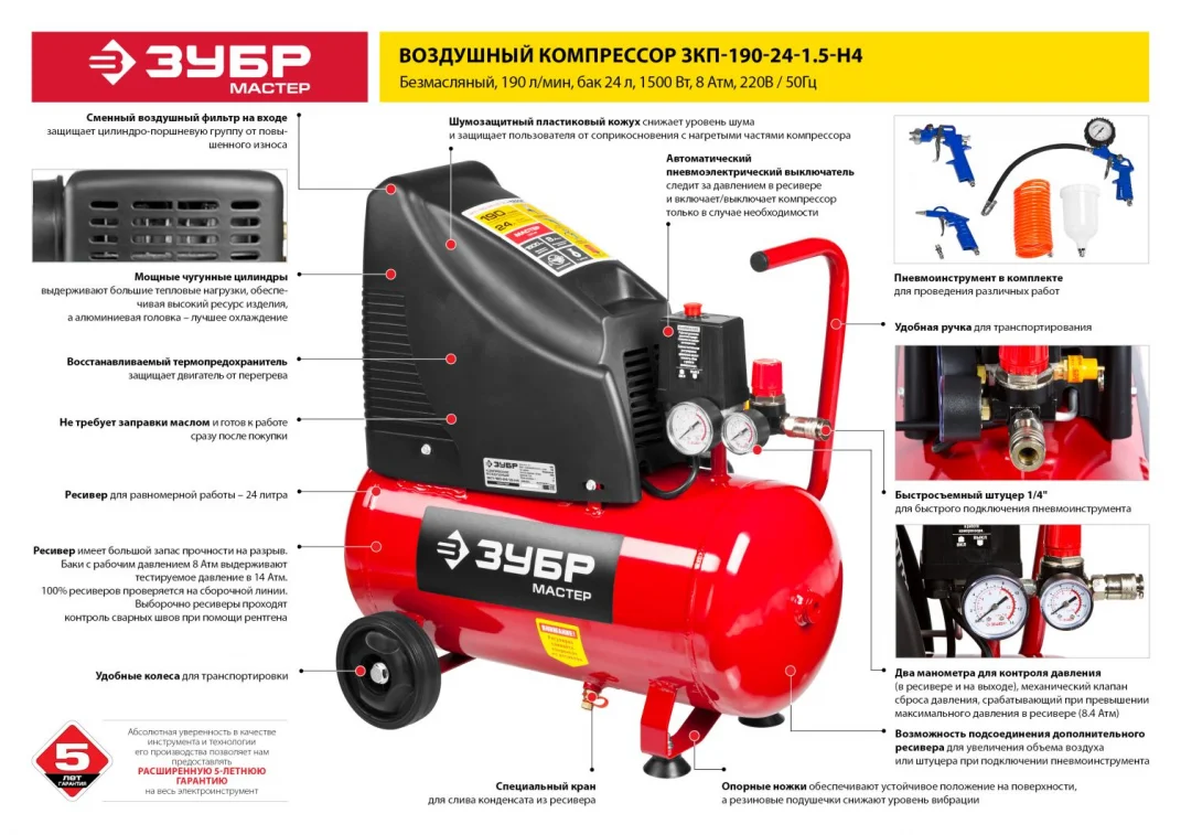 Качественное и надежное переносное оборудование для периодических работ дома, на даче, в небольшой мастерской, а так же для регулярной очистки от пыли офисной и бытовой техники . Безмасляный компрессор - это чистый, без примесей масла, воздух на выходе. При правильной эксплуатации ресурс данных компрессоров составляет не менее 1000 часов*. * на основании результатов испытаний лаборатории компании АО «ЗУБР ОВК»