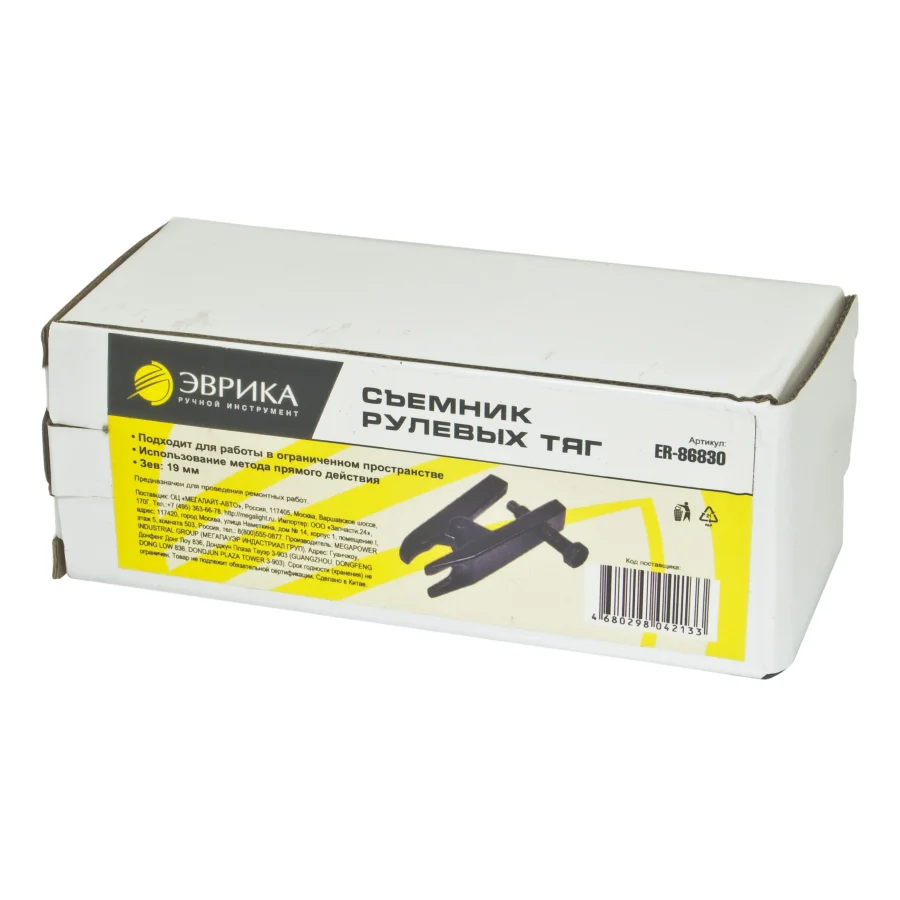 Съемник рулевых тяг зев 19мм для демонтажа и установки рулевой тяги предназначен для снятия и установки рулевой тяги в процессе её замены. Применяется для демонтажа шаровых опор и рулевых наконечников с диаметром пальца не более 19 мм. Позволяет снять деталь без повреждений самой детали и посадочных мест поворотного кулака. Инструмент устанавливается на рулевую тягу и фиксирует гайку, которая крепит рулевую тягу к рейке. После этого можно приступать к снятию рулевой тяги. Технические характеристики: Вес: 1.298 кг