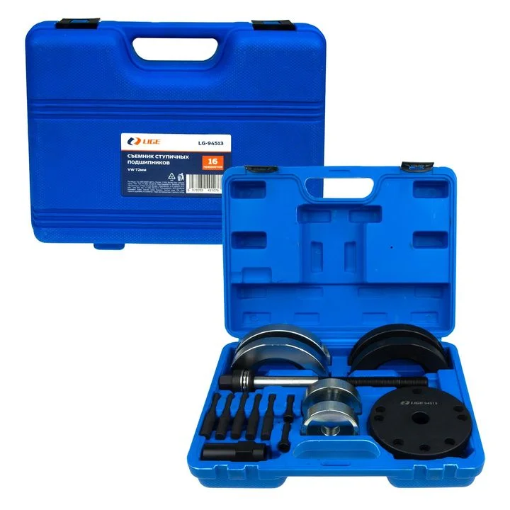 "СЪЕМНИК СТУПИЧНЫХ ПОДШИПНИКОВ 16ПР., (VW 72ММ) ВЕС: 7.00кг. Размер кейса: 333 × 244 × 90мм. Применение: может использоваться непосредственно при замене передних ступичных подшипников. Особенности: не требуется разбирать датчик ABS, можно извлечь соответствующие подшипники. Product material:45# steel. Подходит для Volkswagen Audi, New Jetta, Santana"