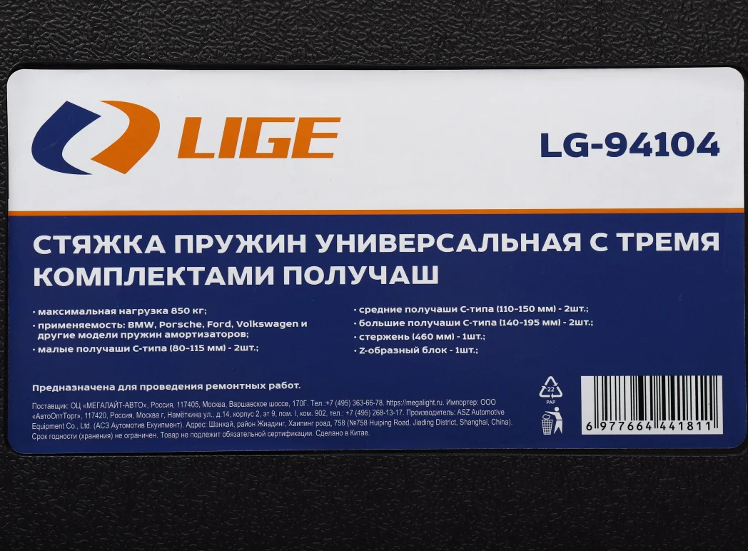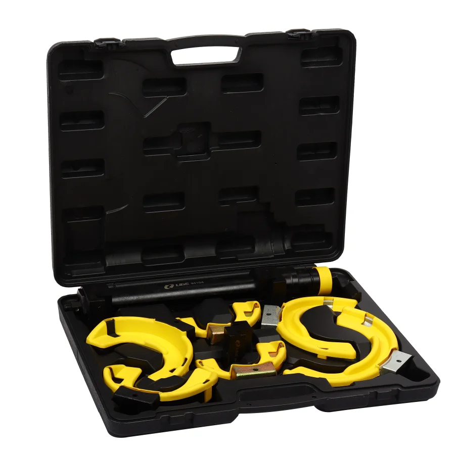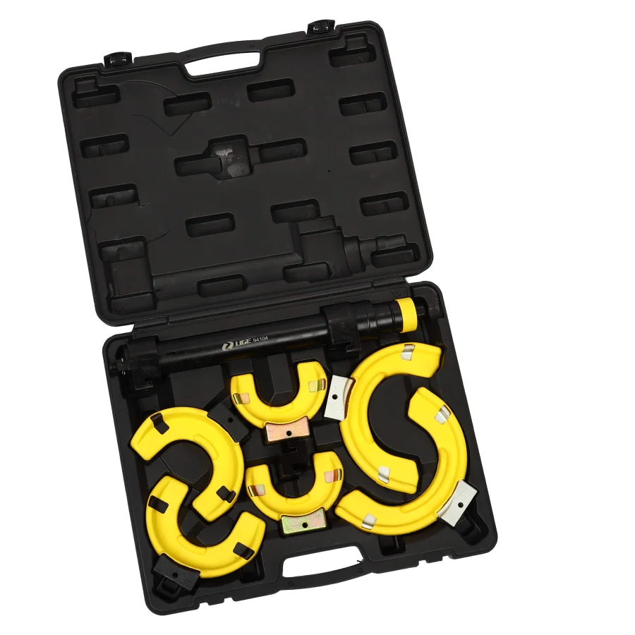 Максимальная нагрузка 850 кг, подходит для BMW, Porsche, Ford, Volkswagen и других моделей пружин амортизаторов. Состав: пара малых получаш C-типа (80–115 мм), пара средних получаш C-типа (110–150 мм), пара больших получаш C-типа (140–195 мм), пара стержней (460 мм), пара Z-образных блоков и пара крепежных винтов (X4).