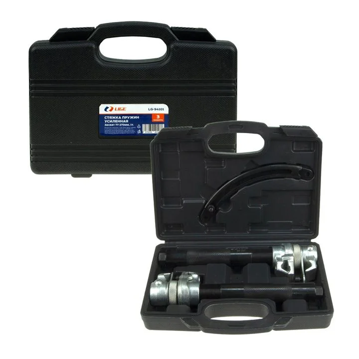 "СТЯЖКА ПРУЖИН УСИЛЕННАЯ (ЗАХВАТ 77-270ММ, 1Т.) 3ПР ВЕС: 4.40кг. Размер кейса: 320 × 225 × 70мм. Максимальный ход захвата: 270 мм. Минимальный ход захвата: 77 мм. Внутренний диаметр ходового винта: φ14 мм. Размер шестигранной гайки основания: 19 мм (для крепления гаечного ключа). Диаметр верхнего штока: φ25 мм. Диаметр нижнего штока: φ32 мм."