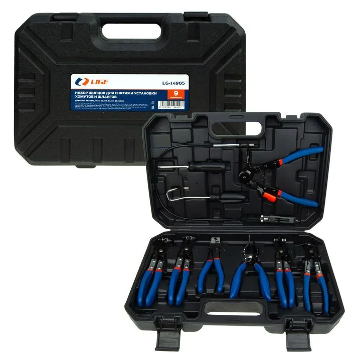 "НАБОР ЩИПЦОВ ДЛЯ СНЯТИЯ И УСТАНОВКИ ХОМУТОВ И ШЛАНГОВ 9ПР Вес: 3.19кг. Размер кейса: 480 × 310 × 90мм. Материал: Высокоуглеродистая сталь Список продукции и характеристики: Название Длина продукта (мм) Длина губки/трубы (мм) Длина ручки (мм) Максимальное раскрытие (мм) Вес (кг) A Гибкие клещи для хомутов 210; 600; 140; 50; 0,45 B Прямые клещи для хомутов 215; 40; 130; 55; 0,22 C Прямые клещи для хомутов 215; 40; 130; 55; 0,22 D Изогнутые клещи для хомутов 220; 60; 135; 60; 0,22 E Прямые клещи для хомутов 215; 40; 130; 62; 0,22 F Клещи для хомутов с тисками 180; 23; 95; 54; 0,23 G Клещи для разделителя шлангов и масляных линий 200; 65; 95; 40; 0,2 H Двусторонняя отвертка 145; -; 83; -; 0,04 I Мини-крючок 190; -; 88; -; 0,07"