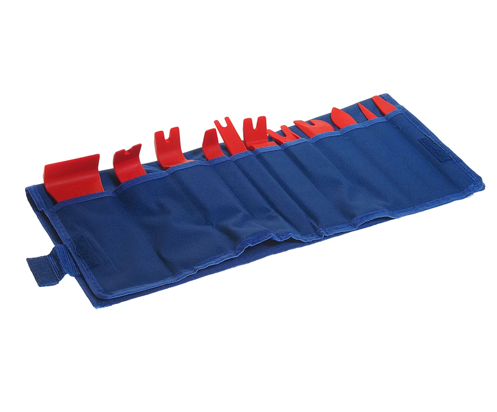 Набор инструментов демонтажа внутренней обшивки салона 11пр. Существует ряд причин, по которым практически каждому владельцу автомобиля приходится снимать элементы обшивки: необходимость получения доступа к электропроводке, установка магнитолы, замена дверных ручек и стекла и т.д. Без специализированного инструмента здесь не обойтись. Поэтому так популярны наборы инструментов, которые сделают эту работу эффективной. С помощью набора для любых видов работ по разборке и сборке салона, вы справитесь с демонтажем любых элементов. Инструменты выполнены из качественных пластиков, поэтому повреждения и царапины вашей машине не страшны.