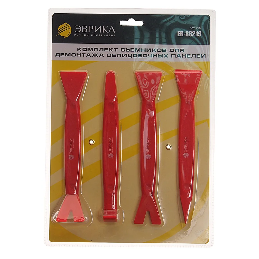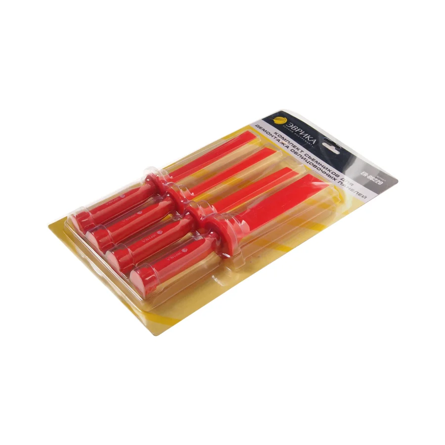 Набор съемников для демонтажа облицовочных панелей с рукояткой, 4 шт. ЭВРИКА ER-86220 выполнен из прочного пластика. Комплект подойдет для работ с различными панелями и клипсами внутри автомобиля. Наличие рукояток позволяет без труда удерживать инструмент и работать в полную силу. Технические характеристики: Назначение: демонтаж панелей Длина: 215 мм Набор: да Количество предметов в наборе: 4 Упаковка: блистер Вес: 0,465 кг Класс товара: Профессиональный