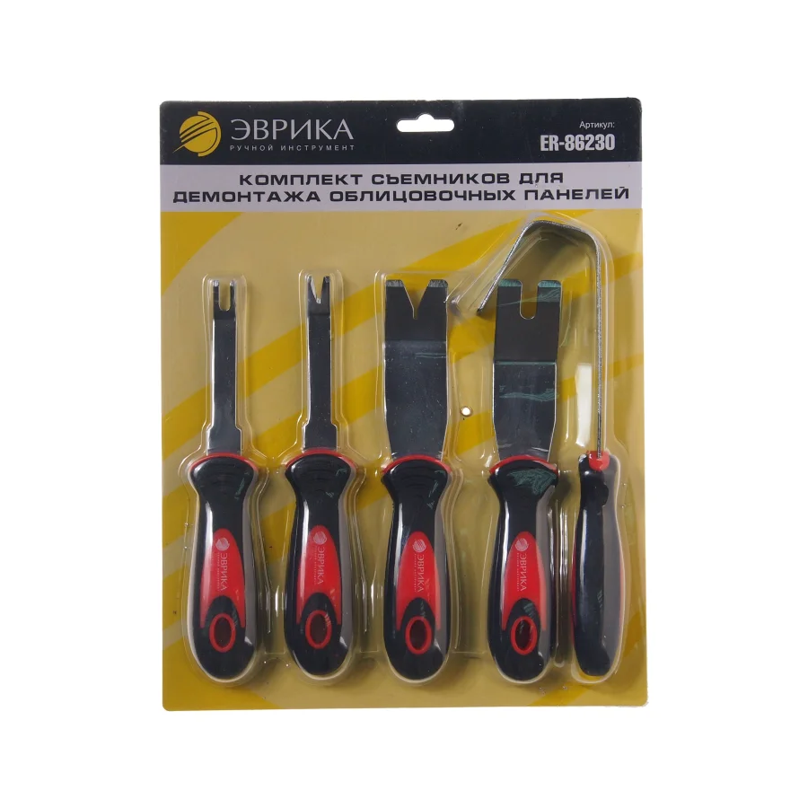 Набор съемников для демонтажа облицовочных панелей, металлические, 5 шт ЭВРИКА ER-86230 поставляется в блистере. Комплект подойдет для работ с различными панелями и клипсами внутри автомобиля. Двухкомпонентные рукоятки не скользят в ладонях. Технические характеристики: Назначение: демонтаж панелей Длина: 255 мм Набор: да Количество предметов в наборе: 5 Упаковка: блистер Вес: 0,698 кг Класс товара: Профессиональный