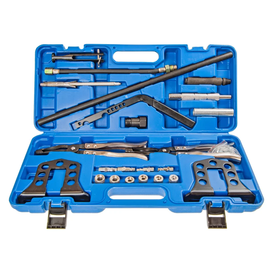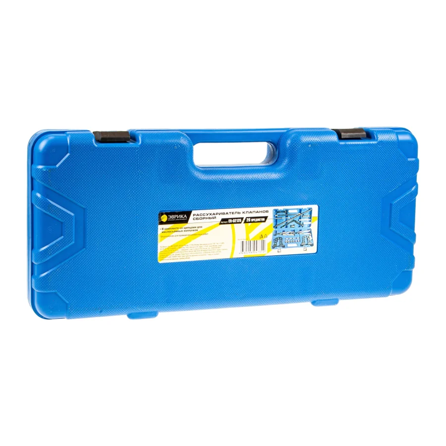 Рассухариватель клапанов ER-02125 сборный в комплекте со щипцами для маслосъемных колпачков, 26пр. в кейсе ЭВРИКА. Набор подходит для 8, 16 и 24 клапанных двигателей. Съемник глубокопосаженных маслосъемных колпачков в комплекте предназначен для снятия колпачков многоклапанных двигателей. Зубчатые удлиненные губки предотвращают проскальзывание. Подходят для глубоко расположенных маслосъемных колпачков. Рекомендуется для профессионального использования. Набор подходит для обслуживания большинства отечественных и импортных автомобилей. Рассухариватель предназначен для сжатия пружин клапанов на снятой головке блока цилиндров, так и прямо на двигателе. Подходит для OHC и OHV бензиновых и дизельных двигателей. Комплектация: 2 держателя опорной штанги; Опорная штанга; Рычаг; Прижимная втулка клапанной пружины; Комплект крепежных винтов и болтов; 2 резьбовых адаптера для подачи воздуха; Шланг воздушный; 4 быстросъемных адаптера для подключения компрессора; Щипцы для снятия маслосъемных колпачков прямые; Щипцы для снятия маслосъемных колпачков изогнутые; Оправки для установки маслосъемных колпачков 5, 6, 7, 8, 10, 11.5мм; Инструмент для снятия и установки сухарей клапанов; Кейс.