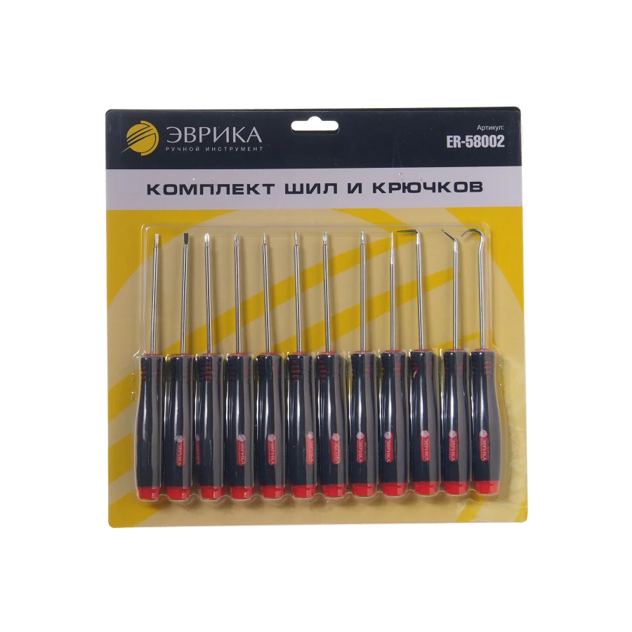 Набор: шило, крючки, отвертки, 12 предметов ЭВРИКА ER-58002 - универсальный комплект ручных инструментов для быстрого и аккуратного демонтажа элементов из узлов автомобиля. Небольшие размеры и узкие наконечники разной формы позволяют использовать изделия даже в труднодоступных местах. Рукояти анатомической формы для комфортного захвата и точной передачи крутящего момента напрямую к детали.