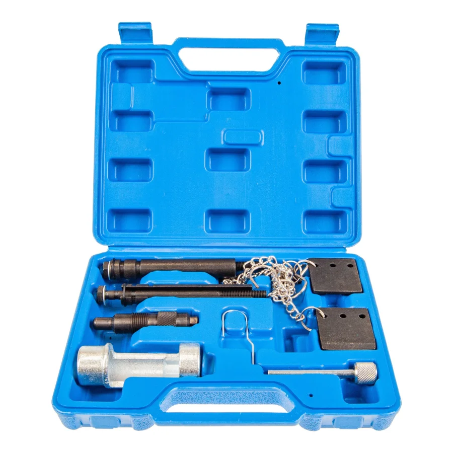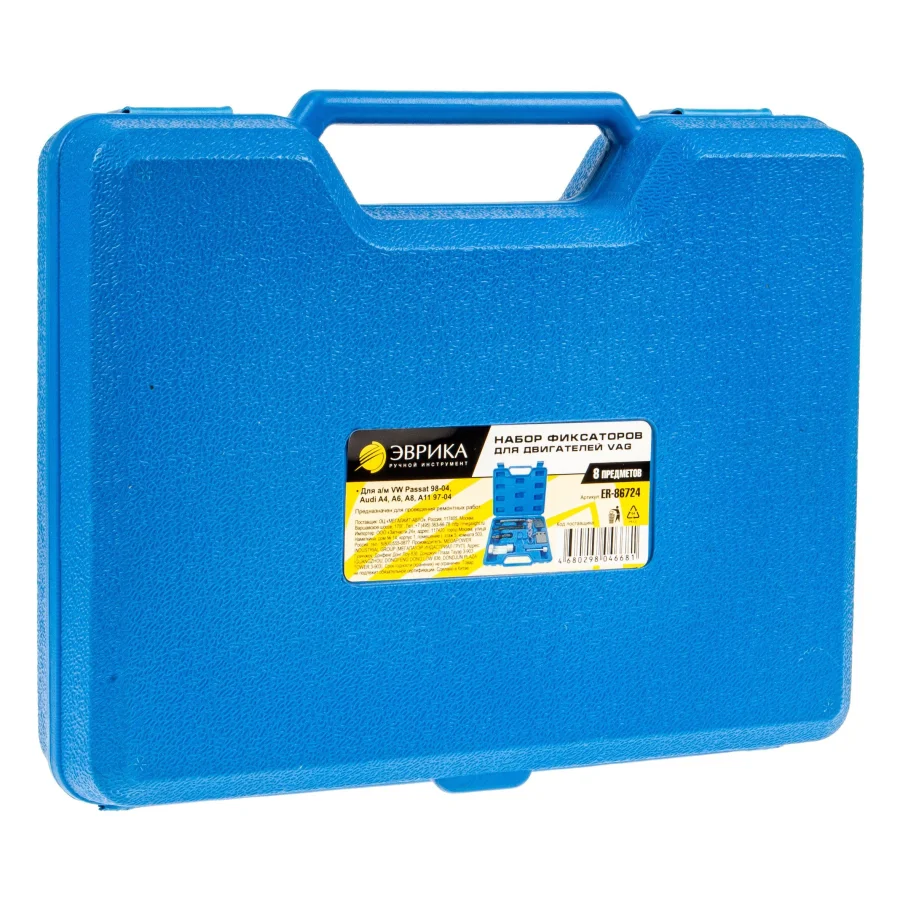 Набор фиксаторов для двигателей VAG(VW Passat 98-04, Audi A4, A6, A8, A11 97-04) 8прелметов в кейсе ЭВРИКА Применяется в автосервисах и станциях техобслуживания в качестве вспомогательного инструмента для быстрого и эффективного ремонта двигателя. Для безопасного хранения и транспортировки используется специальный кейс. Каждый предмет набора располагается на отдельной позиции. Инструмент предназначен для фиксации распредвала в определенной позиции. Применяется: Фольксваген (Volkswagen) Passat 1998-2004; Ауди (Audi) A4,A6.A8,A11 road 1997-2008. Набор инструмента для установки фаз ГРМ для дизельных двигателей Фольксваген (Volkswagen), Ауди (Audi) с мотором объемом 2,5л V6 1997 г.в. В набор входит фиксатор коленвала 3242, который может использоваться на других моделях автомобилей VAG группы (например мотор BBJ). Комплектация: Фиксирующие планки для распределительных валов, ОЕМ 3458 – 2шт Фиксатор коленчатого вала, ОЕМ 3242 – 1шт Головка для натяжителя ремня, ОЕМ 3078 – 1шт Фиксатор гидравлического натяжителя, ОЕМ Т40011 – 1шт Фиксатор ролика натяжителя, ОЕМ Т10060 – 1шт Направляющие для установки передней часть автомобиля в сервисное положение, ОЕМ 3369 – 2шт