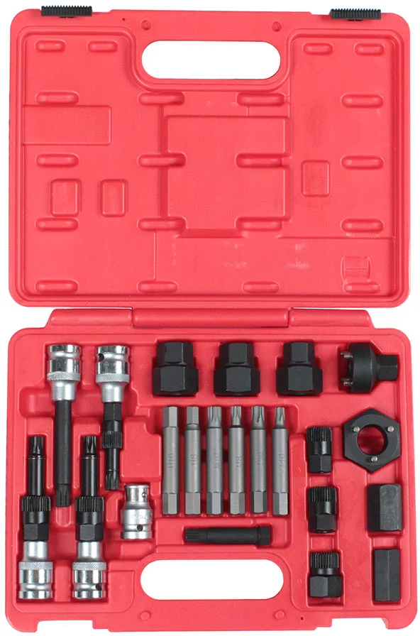 Набор для обслуживания генераторов и обгонных муфт Licota ATF-5218B. Комплект из 20 предметов в пластиковом кейсе содержит головки и вставки для монтажа/демонтажа всех типов шкивов свободного хода Bosch и Denso. Марки автомобилей: VW, Audi, Seat, Mercedes, Renault, BMW, Ford, Fiat, Honda, Toyota, Porsche и т.д.
