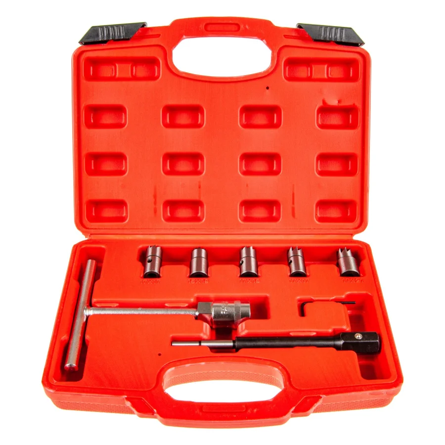 Набор приспособлений для чистки и восстановления посадочных мест форсунок 7предметов(размер фрез: 17x21,17x19,15x19,17x17мм) в кейсе ЭВРИКА. Этот набор для притирки седел форсунок двигателей предназначен для высокоточной очистки и обработки седел форсунок. Он позволяет эффективно устранять нагар и микронеровности, обеспечивая плотное и герметичное прилегание новых форсунок. Применение этого комплекта обеспечивает более плотное прилегание деталей и оптимизирует работу мотора, что способствует его надежности и продуктивности. Комплектация: Универсальная плоская фреза, 15x19 мм; Плоская фреза для форсунок Delphi/Bosch (BMW/PSA/Renault/Ford), 17х17 мм; Угловая фреза для форсунок Mersedes CDI, 17x17 мм; Плоская фреза для форсунок Bosch (Mercedes CRD), 17x19 мм; Угловая развёртка для форсунок Fiat/Iveco, 17x21 мм; Т-образный держатель; Направляющая; Шестигранный ключ. В набор входят фрезы разных размеров, которые подходят для разных типов форсунок и их гнезд.