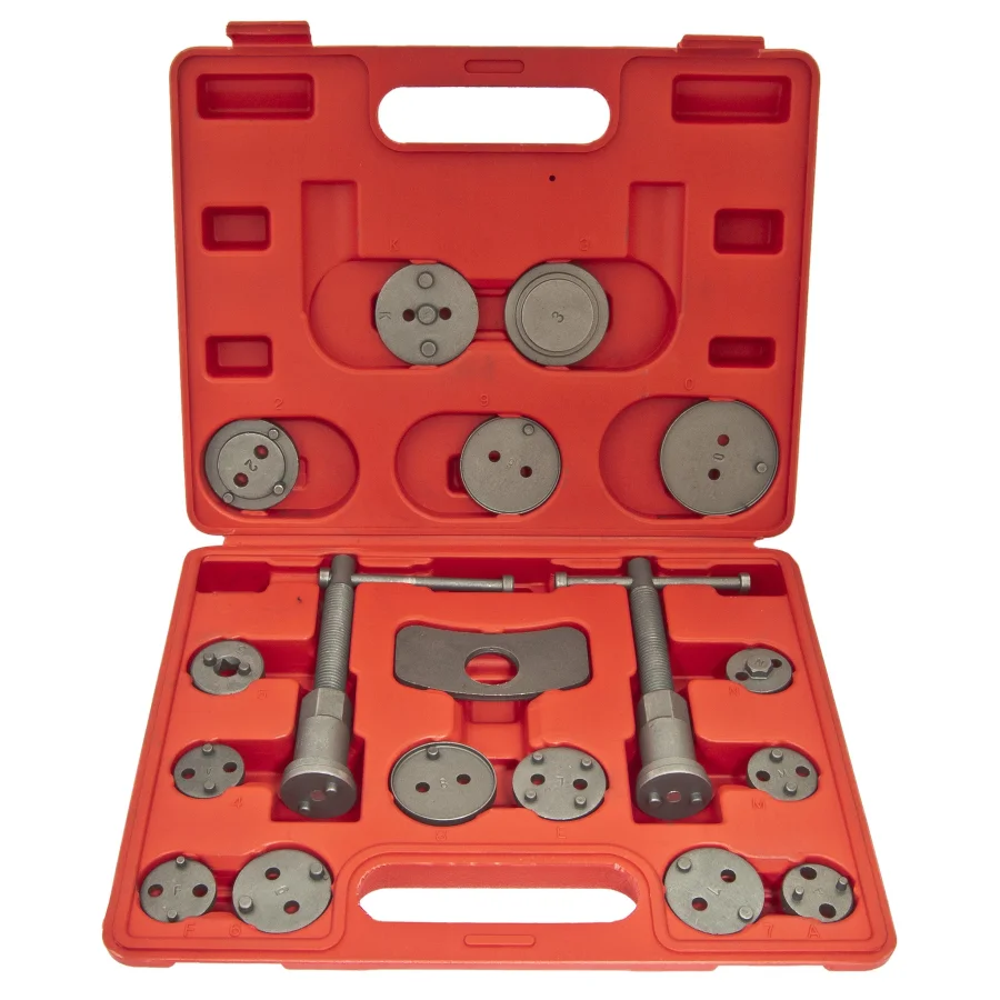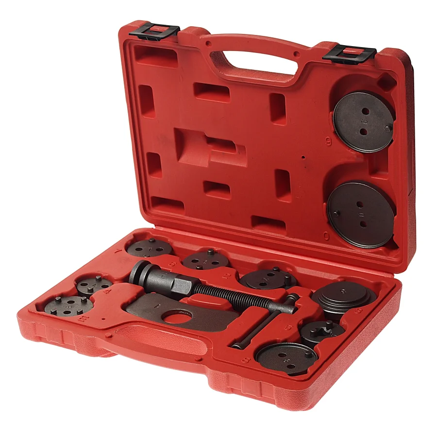 Набор инструмента для сведения тормозных цилиндров, 12 предметов пригодится для автомастерской при ремонте, замене или восстановлении элементов тормозной системы автомобиля. Комплект поставляется в прочном кейсе. Этот комплект инструментов станет незаменимым помощником в ремонте и обслуживании тормозной системы вашего автомобиля. С его помощью вы сможете легко и безопасно выполнять работы по замене тормозных колодок, что значительно упростит процедуру и обеспечит надёжность установки. Инструменты изготовлены из высококачественных материалов, что гарантирует их долговечность и надёжность в эксплуатации. Все компоненты аккуратно упакованы, что делает их удобными для хранения и транспортировки. Набор прост в использовании, даже если у вас нет опыта в ремонте автомобилей. Преимущества этого набора не только в его функциональности, но и в возможности сэкономить на услугах автосервиса. Благодаря этому инструменту вы можете выполнять многие работы самостоятельно, что поможет вам освоить необходимые навыки. Этот комплект подходит как для личного использования, так и в качестве подарка для автолюбителя. Он станет отличным дополнением к набору инструментов для ремонта и поможет быстро решить проблемы, связанные с тормозной системой. Если вы цените качество и надёжность, то этот набор для разведения поршней тормозных цилиндров станет вашим верным помощником.