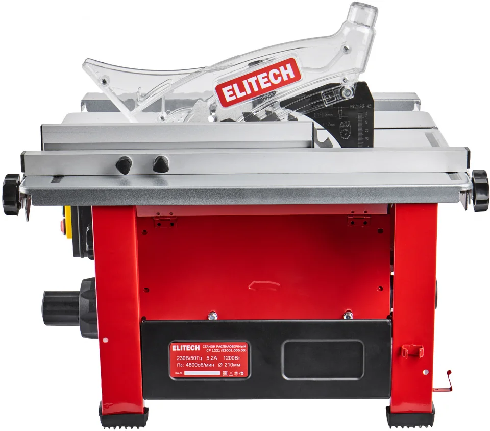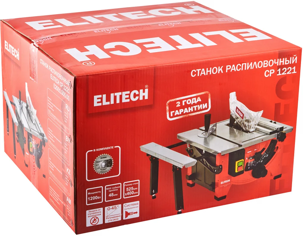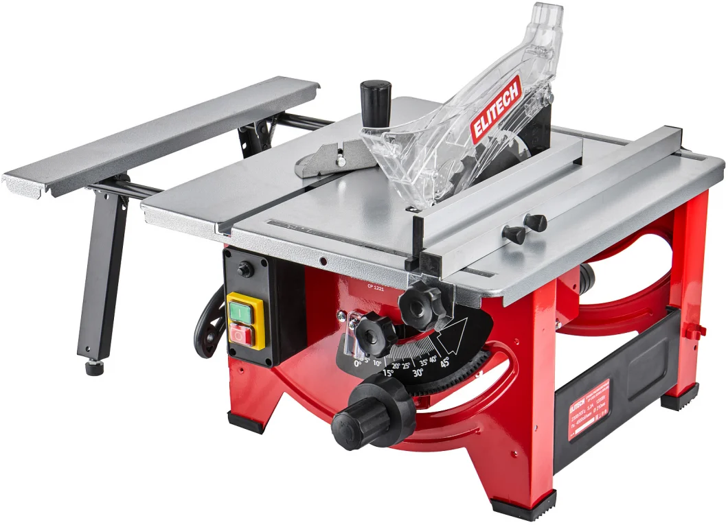 - Распиловочный станок Elitech СР 1221 (E2001.005.00), артикул 207404 мощностью 1200 Вт, с диском 210х30 мм, применяется для продольного или поперечного, косого, наклонного и комбинированного пиления глубиной до 48 мм заготовок из мягких и твёрдых пород древесины и заготовок на основе древесины.