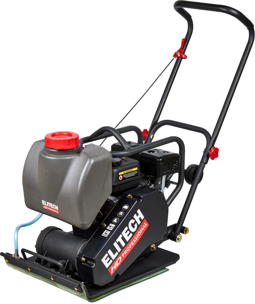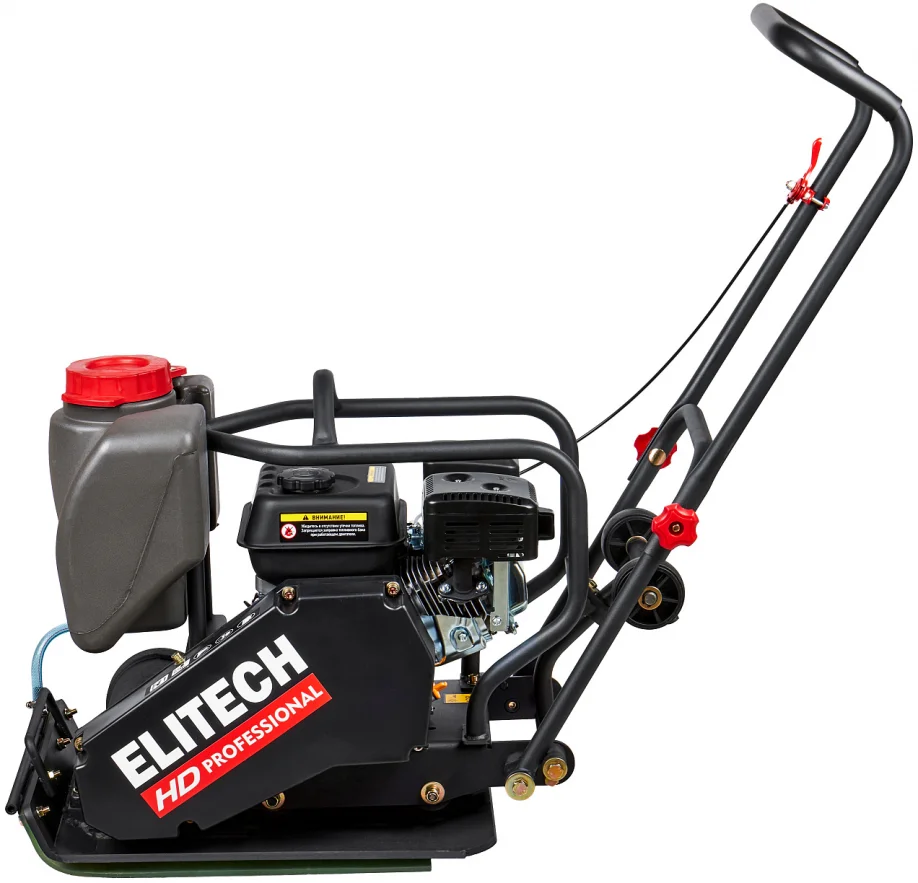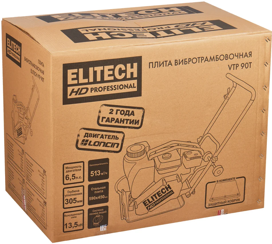- Плита вибротрамбовочная с бензиновым 4-х тактным двигателем Elitech HD VTP 90T, артикул 209186 мощностью 6,5 л.с. и размерами плиты 590х450 мм, предназначена для уплотнения следующих материалов: песка, гравия (в том числе крупного), битумно-гравийной смеси (средней и мелкой зернистости), каменной брусчатки.