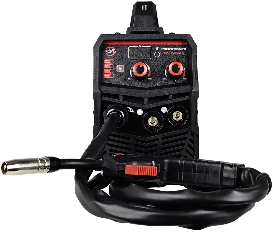 Сварочный полуавтомат инвертор без газа PROFIPOWER MIG-210 (MIG/MMA/TIG, 3 в 1) — универсальный и мощный сварочный аппарат, который объединяет три популярных режима сварки: полуавтоматическую MIG, ручную MMA и TIG. Благодаря инверторной технологии устройство обеспечивает стабильную дугу, высокое качество шва и экономичное энергопотребление. Аппарат работает с напряжением в сети от 140В, и поддерживает сварочный ток в диапазоне до 210 А, что позволяет выполнять работы с различными металлами и толщинами. Конструкция без газа с использованием флюсовой проволоки упрощает работу и делает устройство мобильным и удобным для использования в условиях, где нет возможности подключения к газовому баллону.PROFIPOWER MIG-210 оснащён современным LED-дисплеем для удобного контроля параметров сварки и точной настройки режима. Компактный и лёгкий корпус с надёжной защитой обеспечивает долговечность и безопасность эксплуатации.